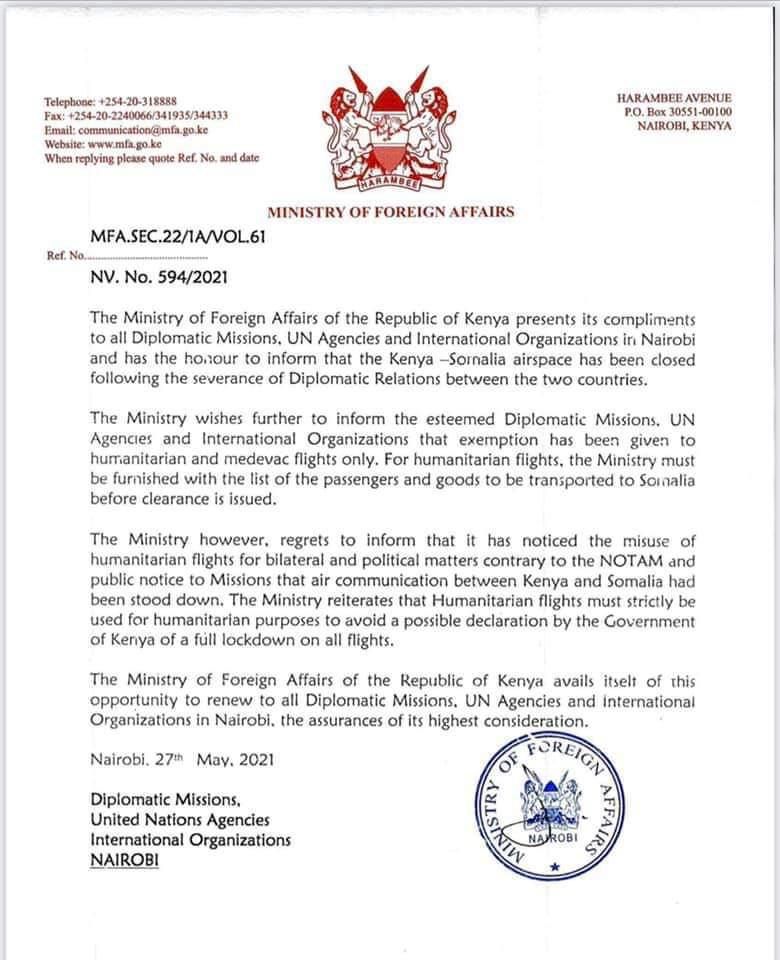 NAIROBI, Kenya - Dowladda Kenya ayaa waxay warqad u dirtay dhamaan howlgalada diblumaasiyadeed ee fadhigoodu yahay magaala madaxda waddankan dhaca Geeska iyo bariga qaaradda Afrika ee Nairobi.