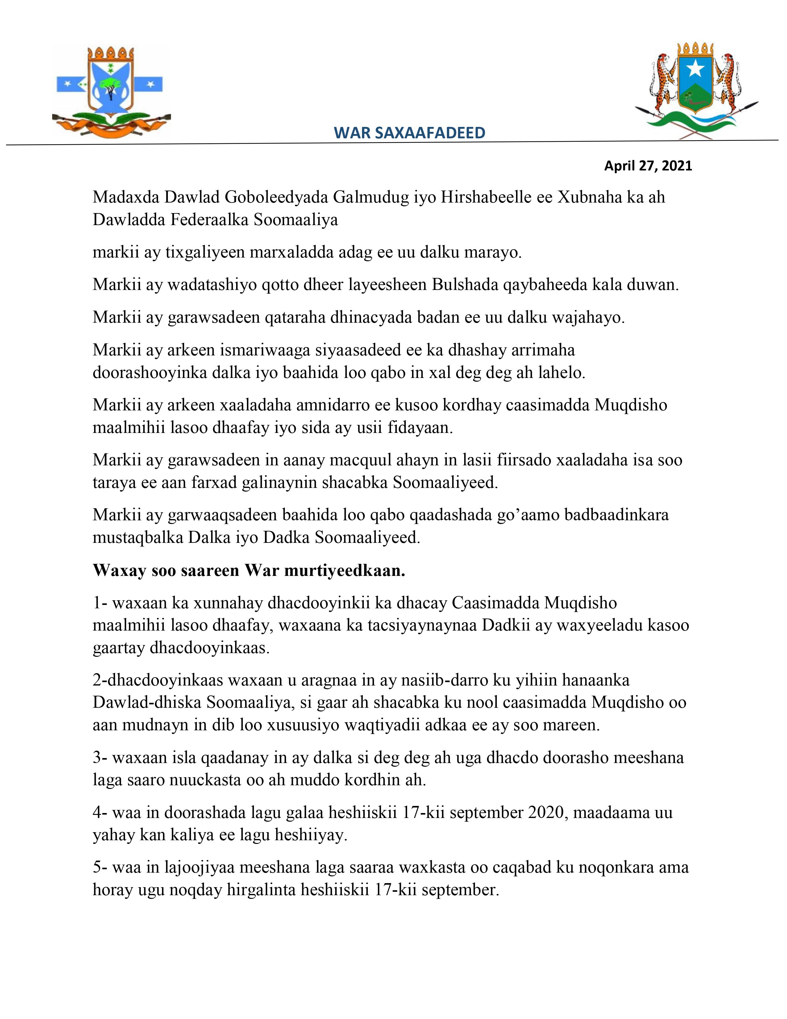 MUQDISHO, Soomaaliya - Maamulada Galmudug iyo HirShabelle ayaa si cad waxay uga hor-yimaadaan nooc kasta oo muddo kororsi ah oo loo sameeyo maamulka muddo xileedkiisu dhacay ee Farmaajo.