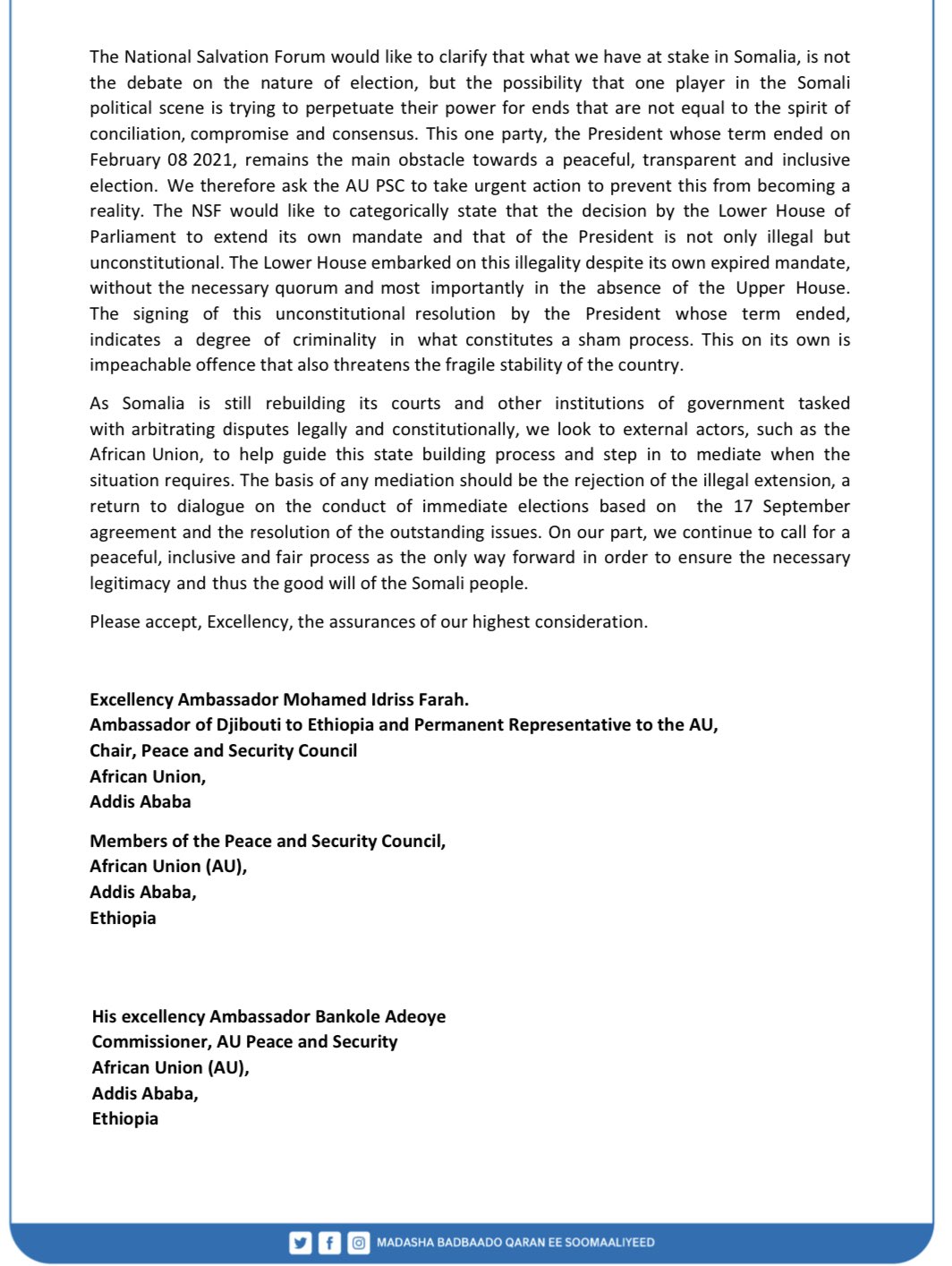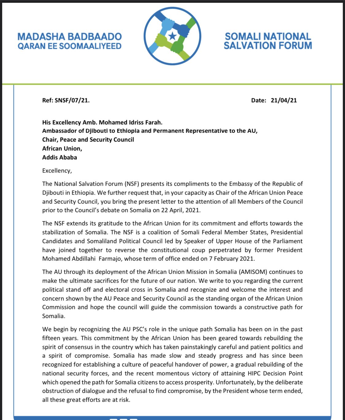 Warqada oo ku taariikheysan 22-ka April isla markaana nuqul kamid ah uu arkay warsidaha Garowe Online ayaa lagu caddeeyay in Farmaajo uu wado "afgembi dastuur" una taagan yihiin sidii ay u baajin lahaayeen.