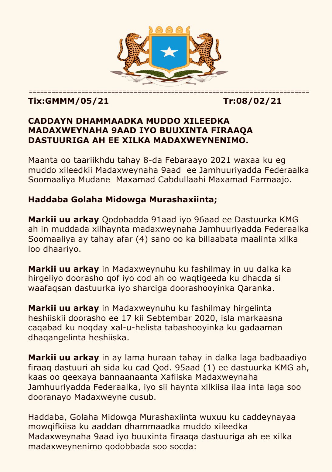 MUQDISHO, Soomaaliya – Midowga Musharaxiinta madaxtinimada Soomaaliya ayaa ku dhawaaqay in Farmaajo aysan u aqoonsan doonin madaxweyne wixii ka dambeeya 8-da bishan Febraayo ee sanadkan 2021-ka.
