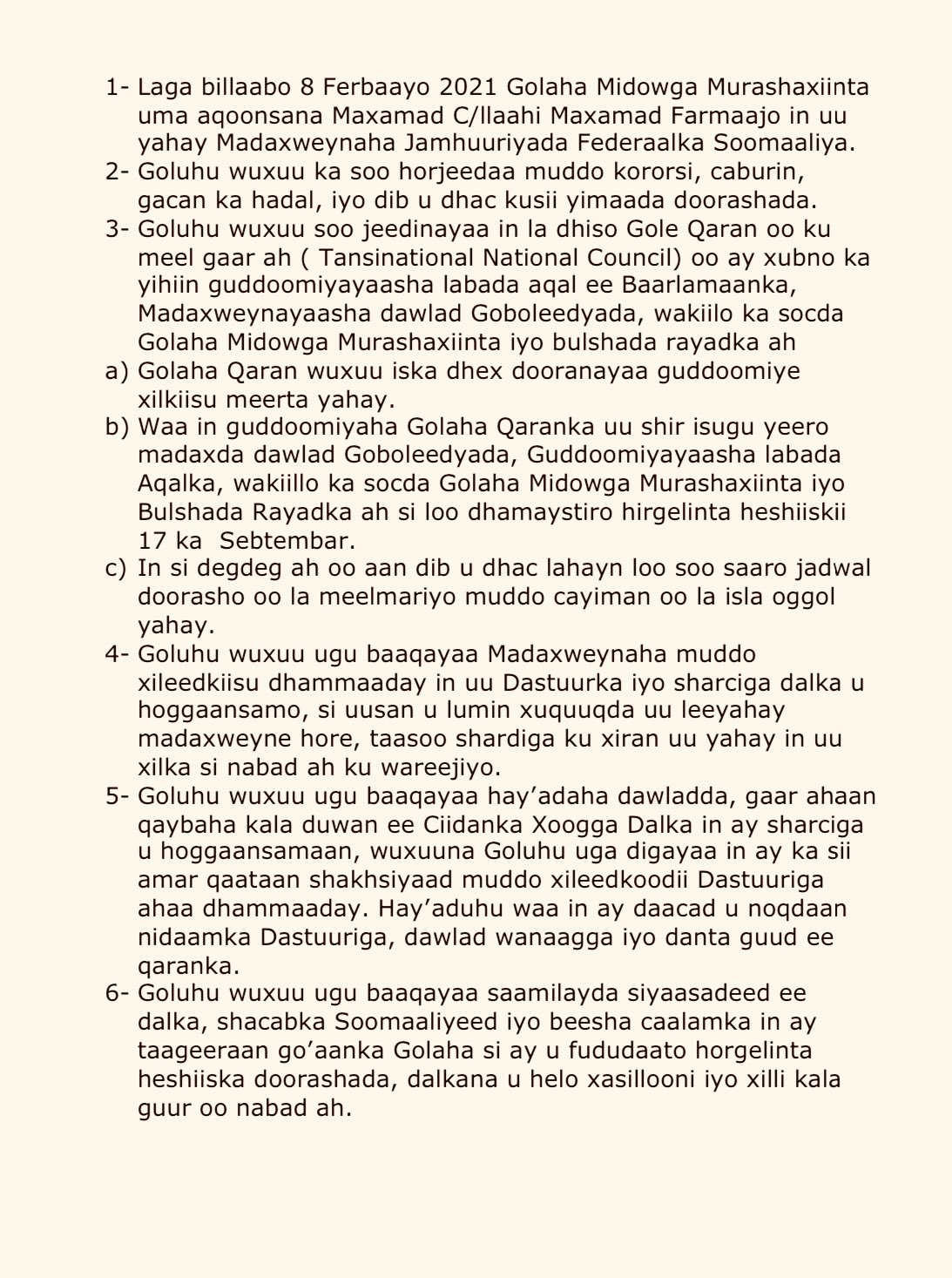 Bayaanka ayay ku caddeeyeen in golaha uu waajibaadkiisa noqon doono in uu ka shaqeeyo jadwal la isla ogol-yahay oo doorashadda ah.