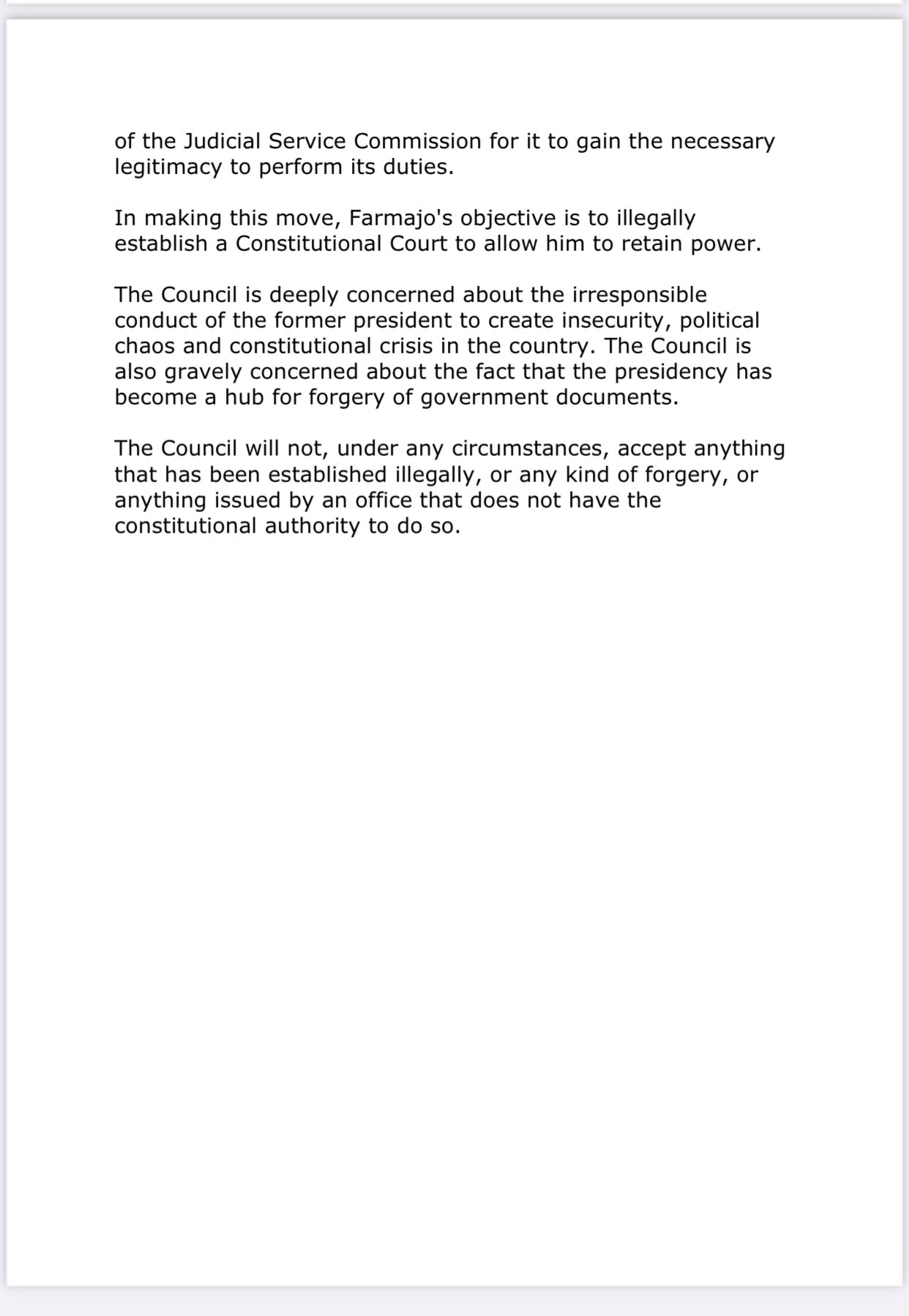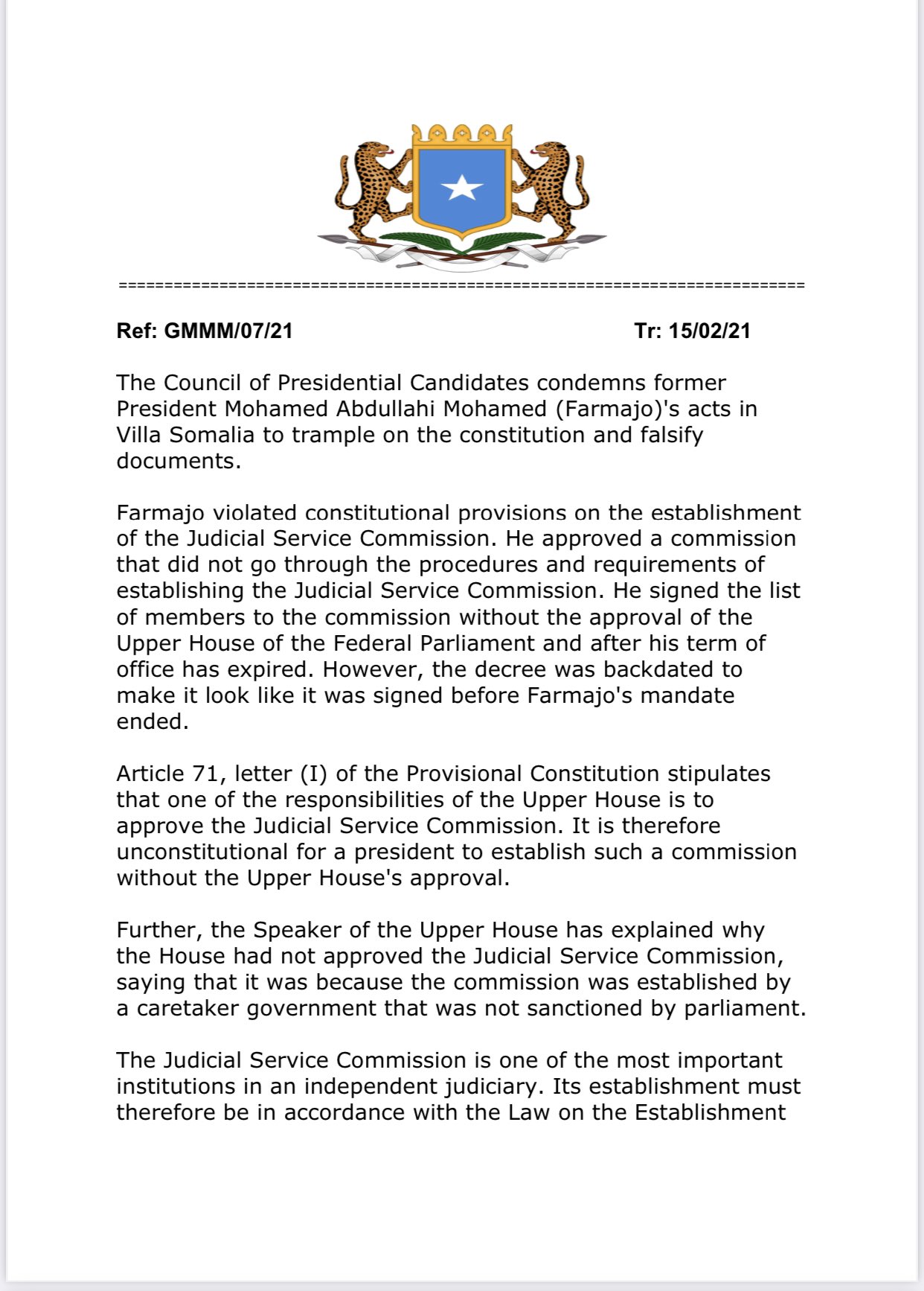 "Golaha Midowga Musharaxiinta wuxuu walaac ka muujinayaa talaabadda mas'uuliyad darada ah ee madaxweynihii hore uu ku abuurayo amni darada, xasilooni darada iyo qalalaasaha dastuuriga ah. Goluhu wuxuu sidoo kale walwal ballaaran ka muujinayaa xaqiiqada ah in Madaxtooyadda ay noqotay xarun lagu sameeyo dukumiintiyada been-abuurka ee dowladda," ayaa lagu yiri qoraalka.