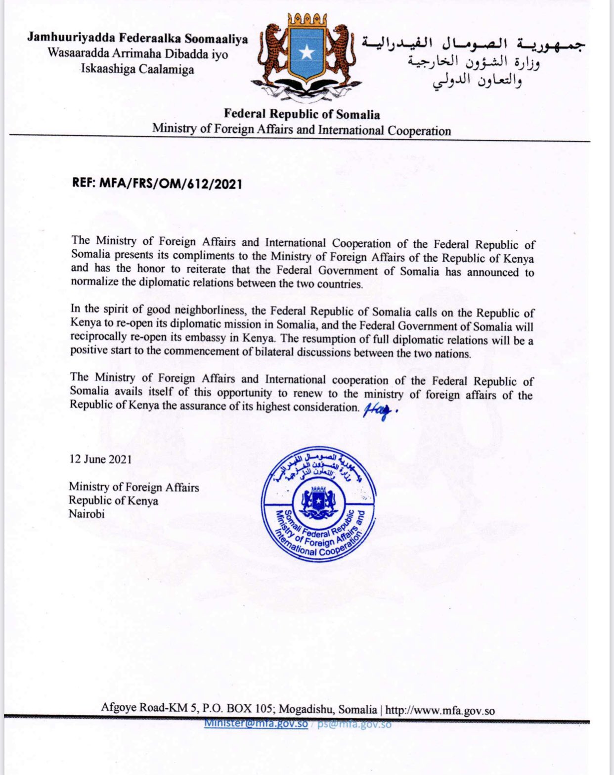 Soomaaliya bishii Diseembar 2020 waxay u jartay xiriirkii diblomaasiyadeed ee ay la lahayd Kenya, iyadoo ku eedeysay Nairobi inay si joogto ah ugu xadgudubto madaxbannaanida Muqdisho Muqdisho waxay dib u soo celisay xiriirkii diblomaasiyadeed ee ay la lahayd Nairobi 5-tii Maajo iyadoo ay dhexdhexaadisay Qatar.